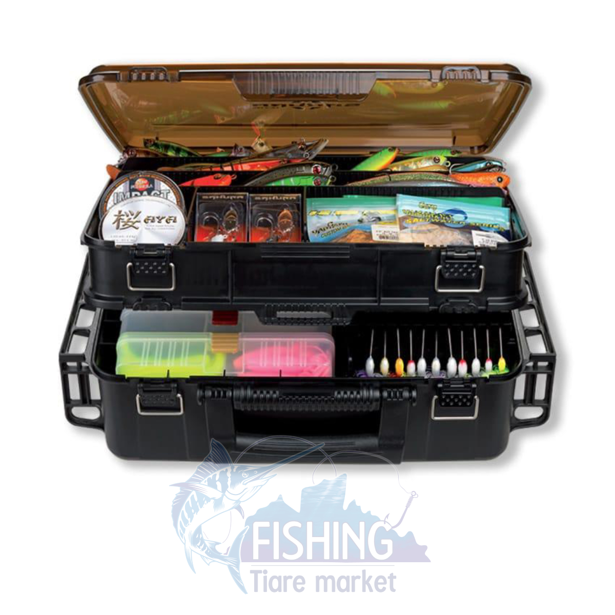 L’étage supérieur est muni d‘une double fermeture par boucles inox couplé à un système clipsant qui sécurise le couvercle. Ce niveau ventilé offre plus de 20 compartiments à cloisons modulables micrométriquement (breveté) ce qui vous permettra d’optimiser le rangement de vos leurres. Du jamais vu !